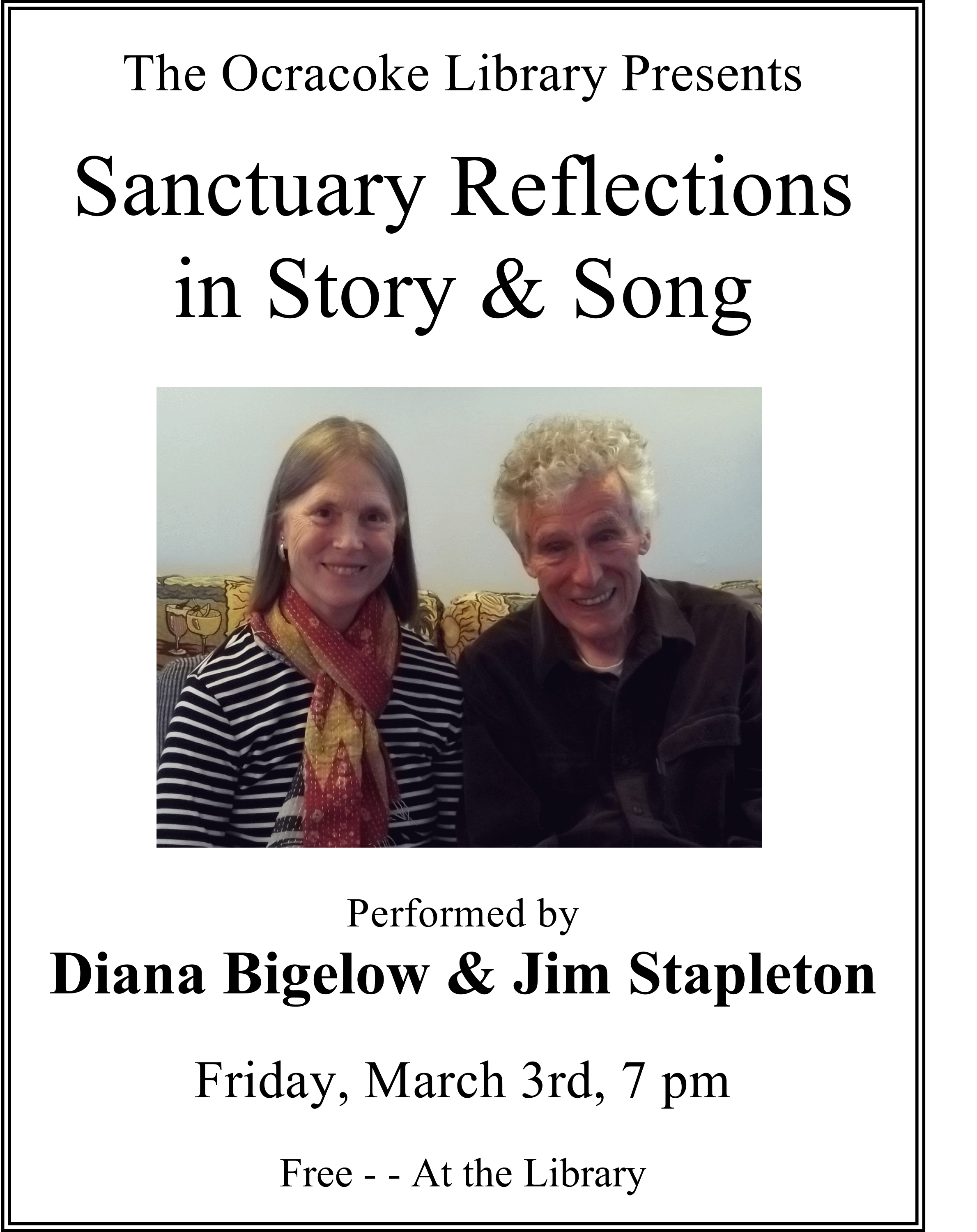The Ocracoke Library will present “Sanctuary Reflections in Story & Song” by Vermont thespians Diana Bigelow and Jim Stapleton at 7 p.m. Friday, March 3.