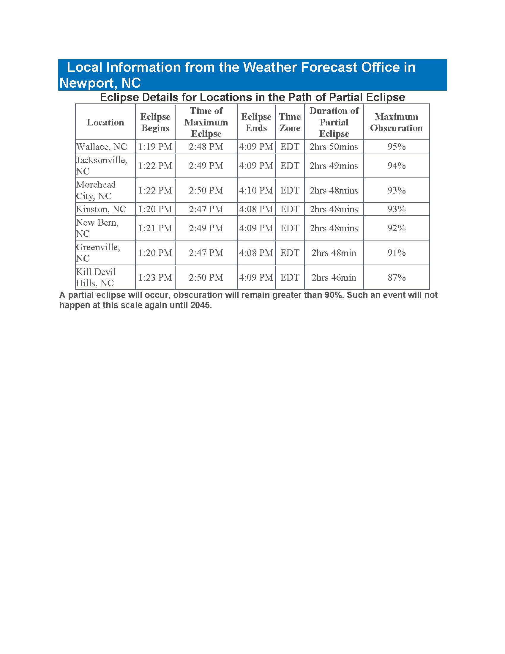As it continues toward South Carolina, those on the Outer Banks will be able to see it at about a 0.9 magnitude, which is a partial eclipse of about 90 percent or more, around 2:50 p.m. Information from the National Weather Service says the partial eclipse will begin around 1:23 p.m.; the peak of 87 percent will be at 2:50 p.m., and the eclipse will end at 4:09 p.m. (See graphic below.)