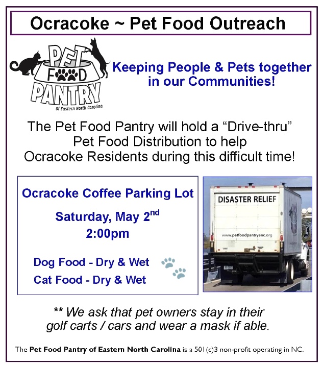 Home News Pet Food Pantry to distribute on Ocracoke today News Pet Food Pantry to distribute on Ocracoke today May 2, 2020 1005 0 The Pet Food Pantry of Eastern North Carolina will distribute pet food at 2 p.m. today (Saturday, May 2) in the Ocracoke Coffee Company parking lot. Share this: Share on Facebook (Opens in new window) Facebook Email a link to a friend (Opens in new window) Email Share on Bluesky (Opens in new window) Bluesky RELATED ARTICLESMORE FROM AUTHOR Media, essential to self-government, need support Used downdraft equipment for sale Ocracoke events March 30 to April 5 Outer Banks Community Foundation annual meeting features Ocracoke highlights Division of Marine Fisheries seeks advisers for Southern Flounder committee
