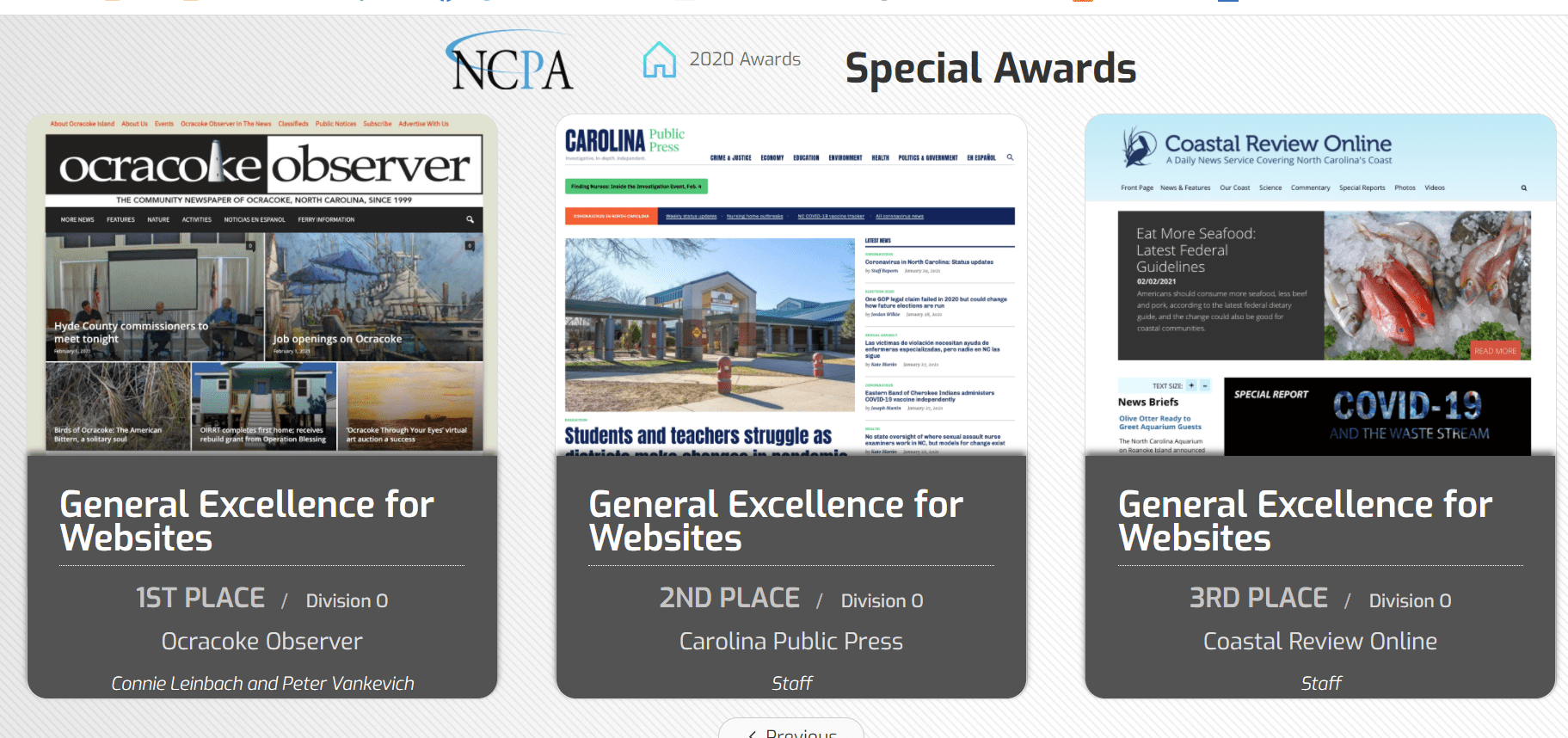 After going to press Friday night (Feb. 27), the Ocracoke Observer learned that it won first place for General Excellence for Website in its division by the North Carolina Press Association.