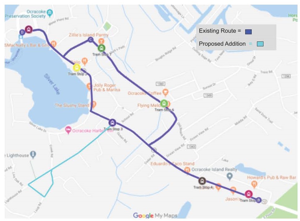 In this proposal, the tram would turn onto Lighthouse Road; pull over and stop at the lighthouse, turn left onto Martha Jane Lane, left onto Loop Road and then rejoin the existing route on Irvin Garrish Highway.