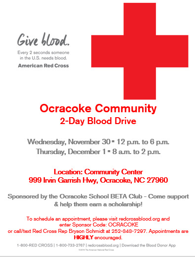 The American Red Cross and Ocracoke School Beta Club and community blood drive scheduled for this week in the Community Center was canceled due to high winds and rough seas that suspended ferry operations Tuesday and part of Wednesday.