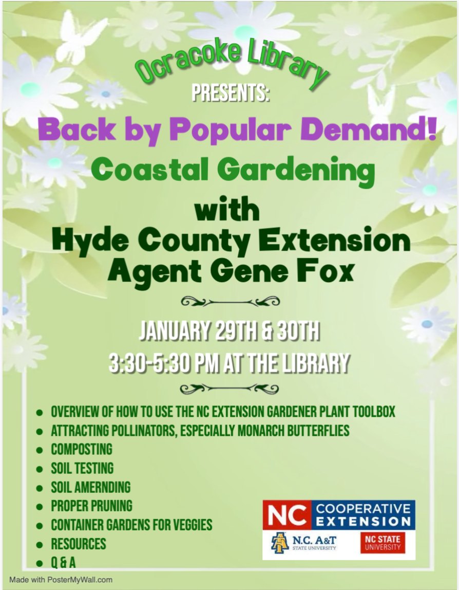 Ocracoke Alive event: Coastal Gardening with Gene Fox (Session 1). Ocracoke Library, 3:30 to 5:30 pm. See flyer below.