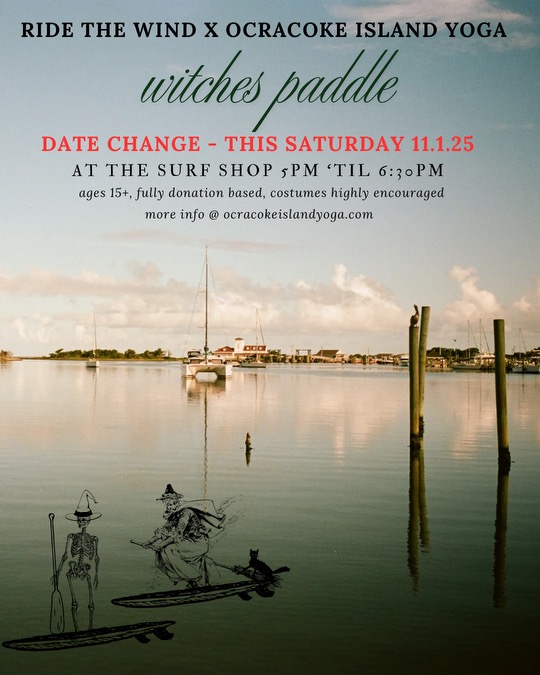 Ride the Wind Surf Shop: Spooky Hour with beer and spooky sales, 4 to 6 pm; Witches Paddle stand-up paddle event. Fee: Donation. Costumes encouraged, 6:30 pm. See flyers below.